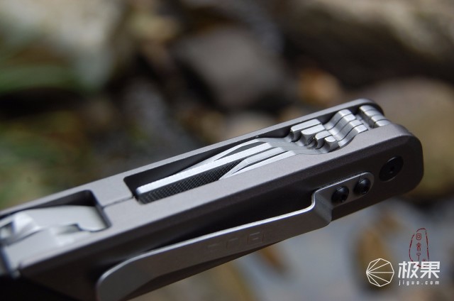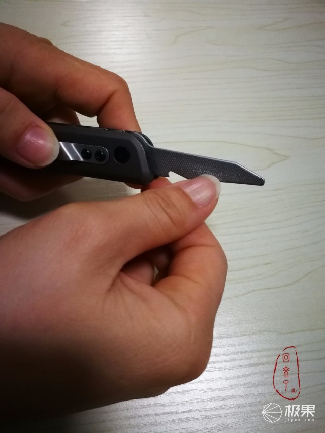 不过必须要格外注意的是闭合状态下小工具间隙很小,每种小工具都设置有开启小凹槽,且凹槽相对错位,仔仔细细地观察的话会发现凹槽设计是有区别的,凹槽的起点也是“一左一右一左一右”错位设计的,要开启某种小工具需借助指甲抠开对应凹槽起点,由于各工具间隙紧凑凹槽小再加上一左一右的凹槽起点设计反而给开启操作带来很大不便,使用的过程很费指甲。
