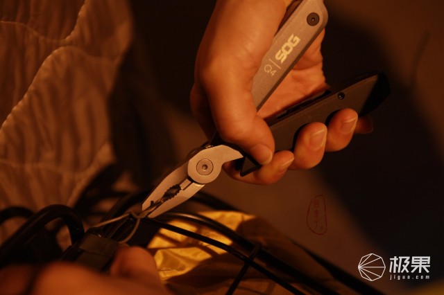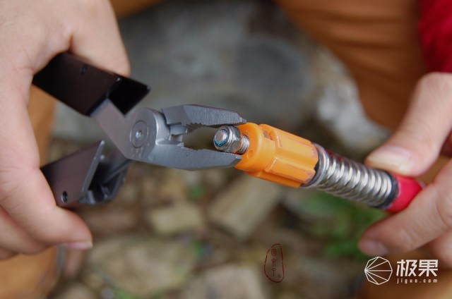 棘轮套筒是有磁吸的,透过筒头可见筒内类似衣服的金属,科技感十足。自己觉得如果棘轮套头可以锁定,可以匹配一枚钨钢攻击头,Q4多功能钳摇身一变就成战术装备,可破窗求生、可战术攻击或防御。