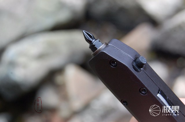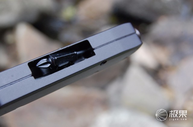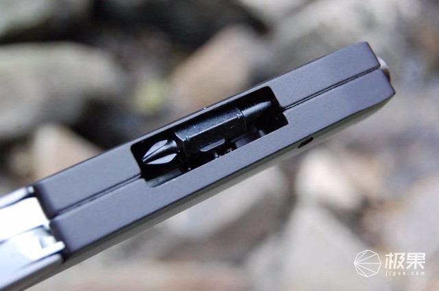 棘轮套筒侧巧妙的设计一螺丝刀头卡扣槽,除了附送的12组件批头套装外,Q4多功能工具钳还标配一“一”字、“十”字两用螺丝刀头隐藏于此,卡扣咬合螺丝刀头力度紧凑,卡扣两侧设为不同深度凹槽,当需取用螺丝刀头时,轻摁深凹槽一侧的螺丝刀头,浅凹槽侧的螺丝刀头便会翘起,方便拿取,很赞的细节设计。