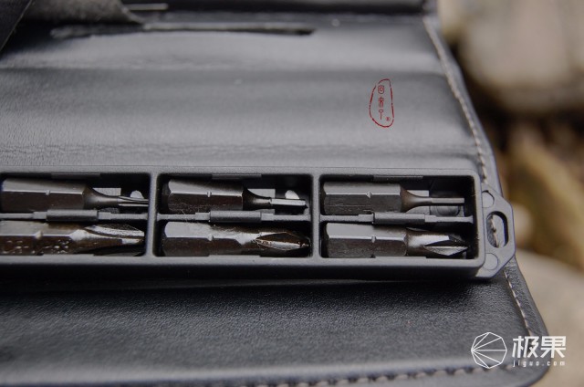 附送的12批头套装则分别卡扣在塑料卡槽中,塑料卡槽可从皮套中取出,能够正常的看到卡槽背面设计有磁片,置于牛皮收纳套中时会有一定磁吸力,避免卡槽意外滑出,卡槽上的卡扣虽为塑料卡扣但一样弹力紧实,当要拿取批头时需从卡槽背面摁出对应批头。