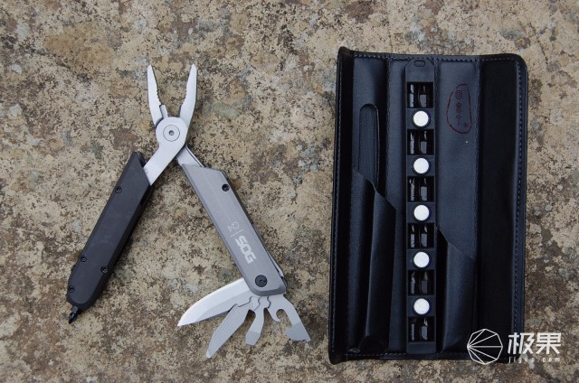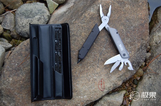 打开包装盒,随Q4主多功能工具钳配套一个牛皮收纳套,收纳套内部还有附送的12种批头改锥。