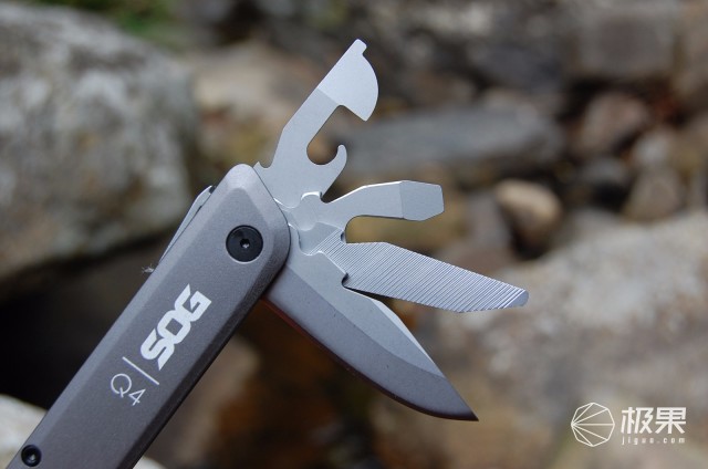Q4钳臂另一侧则为多功能小工具,分别为直刀、开瓶器/大一字、开罐器/小一字、三面锉刀,采用保险卡扣锁定,开合小工具均通过保险卡扣完成,保证安全。