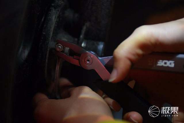 Q4在钳臀两边分别设计有不同功能小工具,其中一侧为棘轮改锥套筒(至于棘轮,简单说就是使改锥只能朝一个方向转动,朝另一方向空转,由于篇幅有限就不展开科谱,详细知识可度娘),另一侧为直刀等多功能工具。